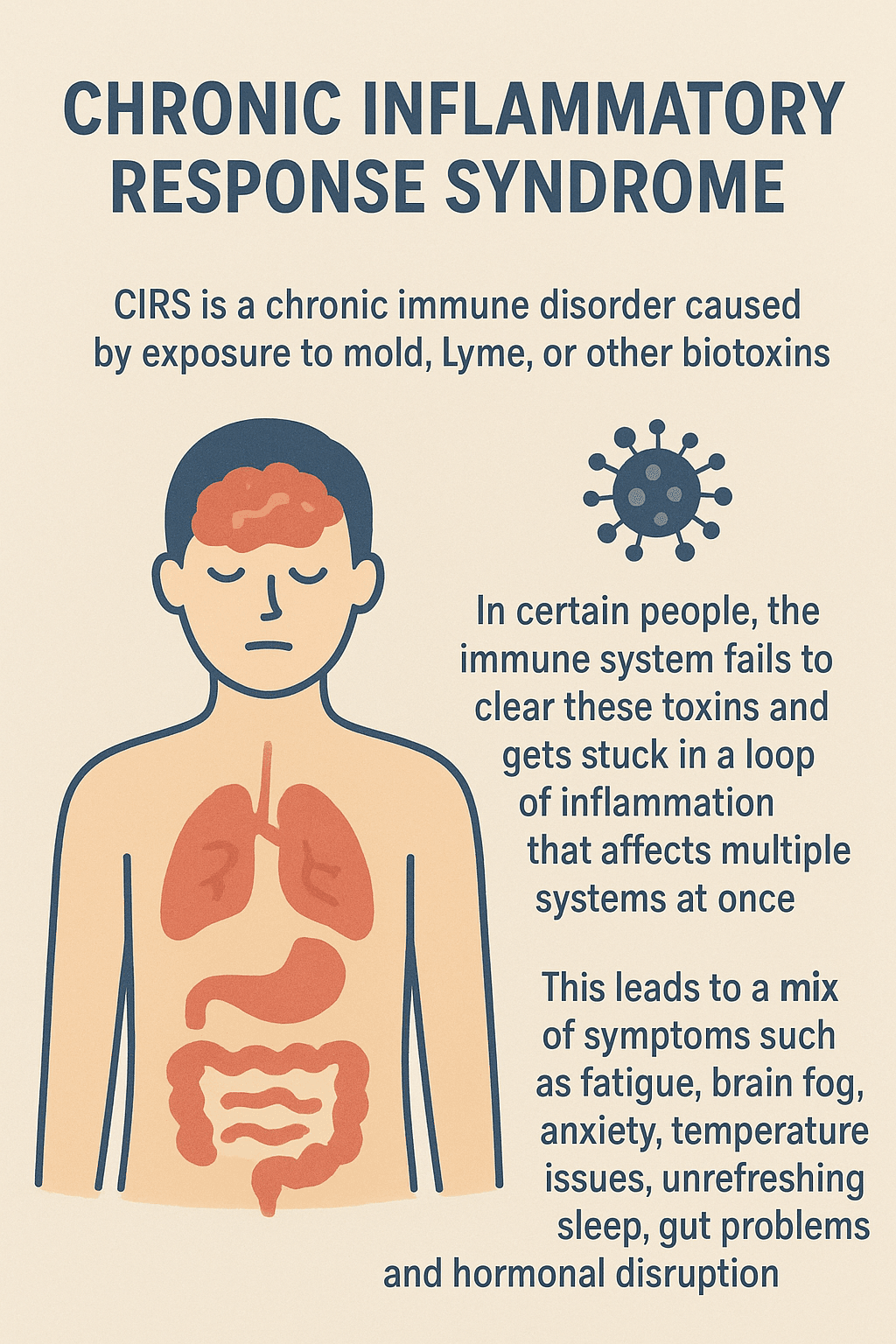 Chronic Inflammatory Response Syndrome (CIRS) is a chronic immune disorder caused by exposure to mold, Lyme, or other biotoxins. In people with certain genetics, the immune system fails to clear these toxins and instead gets stuck in a loop of inflammation that affects multiple systems at once — including the brain, hormones, immune system, gut and nervous system. This is why people experience a mix of symptoms like fatigue, brain fog, anxiety, temperature issues, unrefreshing sleep, gut problems and hormonal disruption — often misdiagnosed as burnout, autoimmune disease, long COVID, fibromyalgia or ME/CFS.