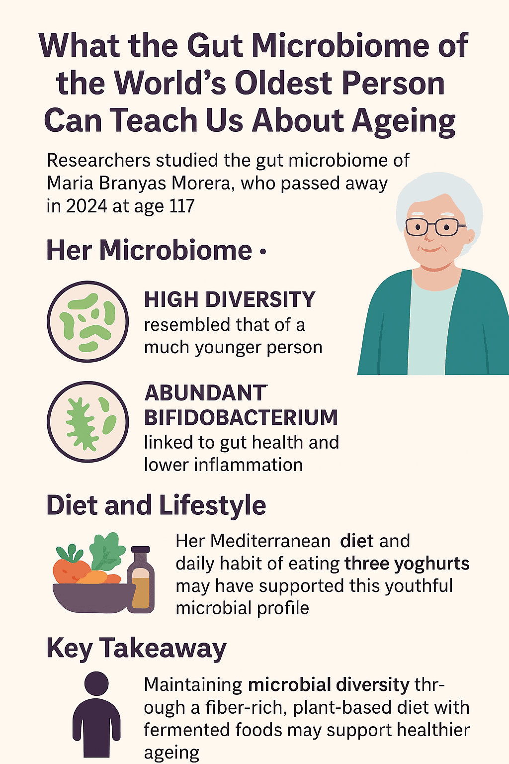 While there is no single “longevity microbiome,” evidence increasingly supports that a balanced, fiber-rich diet with fermented foods can help sustain beneficial bacteria and promote healthier ageing — much like MarÃa Branyas Morera’s remarkable example.